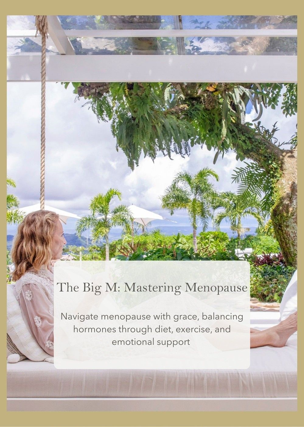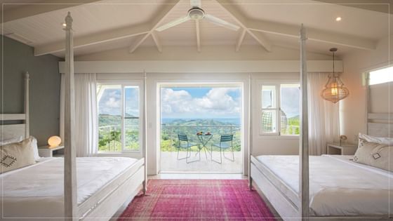 Spacious room with breathtaking views of the lush valley and Pacific Ocean, featuring a balcony with swing chairs.